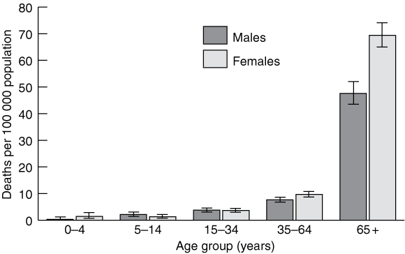 From 1997 to 2001, there were, on average, 98 asthma-related deaths per year among men and 182 per year among women aged 65 and over.1 Box 2 shows that asthma-related death rates in people aged 65 and over far exceed rates in younger age groups. In fact, most deaths attributed to asthma occur in this older age group. Within this group, certain subgroups may be at greater risk of death from asthma. Although asthma is actually less common among older people of non-English-speaking backgrounds, their mortality rate from asthma is relatively higher (134 v 70 per 100 000 people with asthma).1