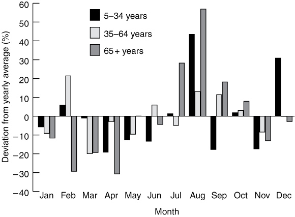 Data on seasonal variation are less subject to misclassification bias. Among older people, there is a seasonal increase in mortality from asthma in the winter months of July and August. The lowest death rates from asthma in this age group are recorded in February to April. The seasonal variation observed in older people differs from that recorded in younger people (Box 3).