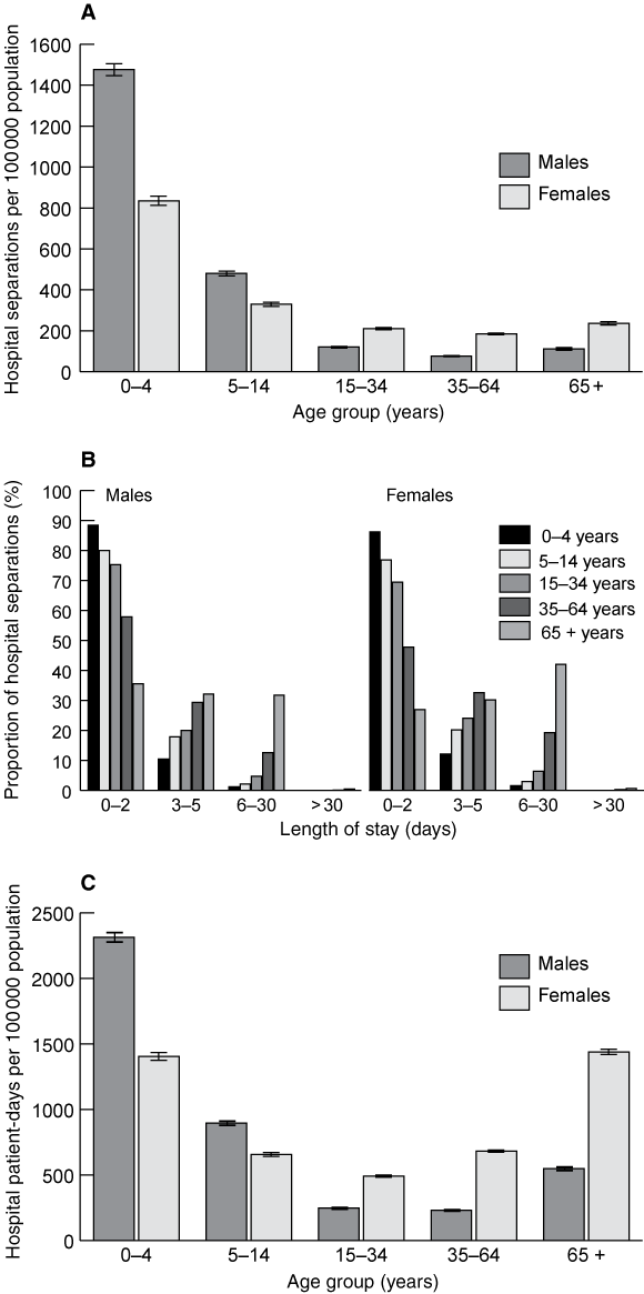 The largest users of health care services for asthma, including hospital care, are children. However, longer hospital stays mean that the number of bed-days used for asthma is relatively high among older people (Box 4). Similarly, although children have the highest rates of visits to general practitioners for asthma, rates in older people are higher than rates in younger adults (Box 5).