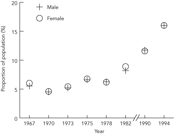 At each survey, participants completed an extensive questionnaire on demography, cigarette smoking, alcohol intake, use of medications, previous and current medical history and current respiratory symptoms. Standing height and weight were measured, and skinprick tests to common inhaled allergens were performed. Spirometry was performed with dry spirometers (McDermott) from 1966 to 1969, wedge spirometers (Vitalograph) from 1972 to 1981 and pneumotachographs (Welch-Allyn) in the 1994–1995 survey. Forced expiratory volume in 1 second (FEV1) and forced vital capacity (FVC) were measured and expressed as percentages of predicted value.9 In selected participants in the 1981 and 1990 surveys and all participants in the 1994–1995 survey, the dose of inhaled methacholine that provoked a 20% fall in FEV1 (PD20) was calculated to assess airway responsiveness. Atopy was defined as any skinprick test response that produced a weal of more than 2 mm, and airway hyper-responsiveness was defined as a PD20 of less than 4 μmol. Secular trends in the prevalence of doctor-diagnosed asthma were age-corrected. Cross-sectional data were analysed by decade only for participants who were older than 18 years at the time of the study.