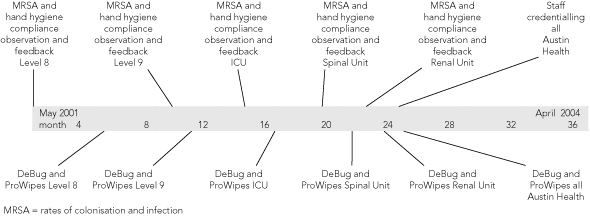 Operation Clean Start (OCS) was an integrated 3-year program consisting of MRSA screening of patients, health care workers, and the environment; feedback of results; and introduction of a series of specific interventions, which were supported by a detailed educational and promotional package. OCS was introduced from May 2001 in a stepwise, timetabled manner to five “sentinel areas” (Box 1), which had been identified as having high rates of MRSA infection, all located at the main acute campus (Austin Hospital). The sentinel areas comprised two clusters of acute-surgical wards (level 8 [3 wards] and level 9 [3 wards]), the intensive care unit (ICU), the renal unit and the spinal injuries unit. From April 2003, aspects of OCS were extended across the remaining 23 wards and all three campuses. The program was funded by a Quality Improvement Fund grant from the Department of Human Services, Victoria (AUD$584 000 over 3 years).