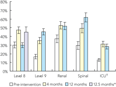 * The screening was repeated 2 weeks after the 12-month assessment on level 8 because results were confounded by a group of new student nurses who had just arrived on the ward. †The method for measuring compliance is not directly comparable between the intensive care unit (ICU) and other areas.