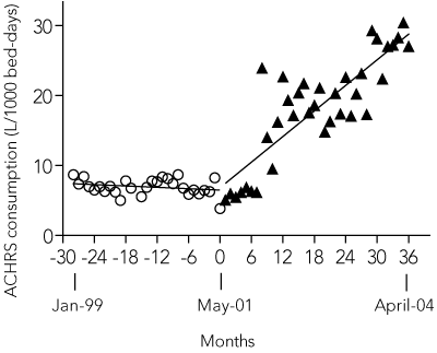 We have confirmed the findings by Pittet et al,11 in which the introduction and promotion of ACHRS to a large teaching hospital was followed by sustained improvements in both hand hygiene compliance and reductions in MRSA infections. Since their report, other smaller studies have reported benefits from ACHRS programs.21-23 Only one group assessed an institution-wide approach such as ours, but unlike us, they systematically screened patients and isolated those with MRSA.21 Although isolation and cohorting of MRSA colonised patients is recommended,24-26 hospital design may prevent the use of this option, and a recent study suggests it may not be effective, at least in the ICU.27 Our study shows that, even in a highly MRSA-endemic setting, rates of clinical MRSA infection, including bacteraemia, can be cut substantially by promoting ACHRS, improving cleaning of shared ward equipment, and using targeted patient decontamination. Although isolation and cohorting of MRSA-infected patients would have been optimal, this was not practical given our hospital infrastructure.