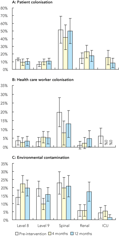 In the ICU only, health care worker colonisation rates 4 and 12 months post-intervention were significantly lower than baseline.