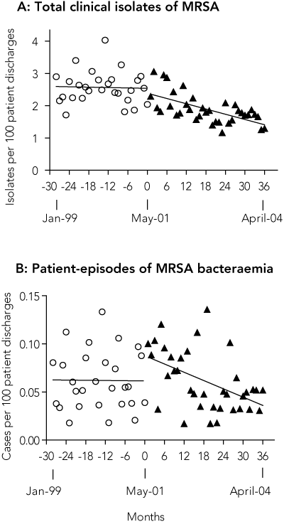 B: Patient episodes of MRSA bacteraemia before and after intervention for all Austin Health. Fitted linear regression curves are shown for each period. Only the first isolate was recorded for a given patient, unless 14 days with negative cultures had elapsed, in which case a subsequent episode(s) was recorded.