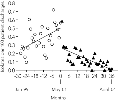 Trends for MRSA (or ESBL) rates over time were assessed using interrupted time-series segmented regression analysis.20 Statistical analyses of the slopes of the linear regression curves were performed using GraphPad Prism version 4.0 for Windows (GraphPad Software, San Diego, Calif, USA).