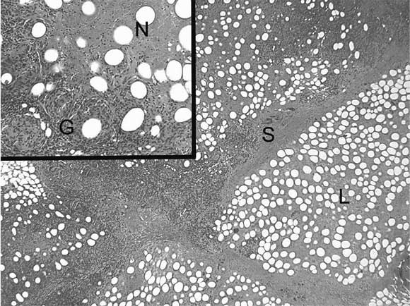 The lower-power image shows florid inflammatory changes involving fat lobules (L) with thickening of lobular septa (S), consistent with a florid, predominantly lobular, panniculitis. The higher-power image (inset) shows a classical combination of granulomatous inflammation (G) and eosinophilic granular fat necrosis (N).