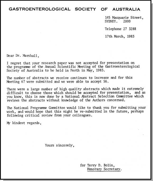 In January 1983, to stake their individual legitimacy in the evolving H. pylori story, Warren and Marshall submitted two separate research letters outlining their preliminary data to The Lancet. Publication was delayed, as Robin Fox, an editor at The Lancet, wanted to know why there were two separate letters. These were eventually published in June of that year.5 Locally, an abstract outlining preliminary findings of the 100-patient study was not accepted by the Gastroenterological Society of Australia for presentation at its annual conference (Box 2), and difficulties attended the submission of the definitive paper of the 100-patient study to The Lancet in January 1984. Once again, the journal’s Editor-in-Chief, Ian Munro, was challenged — this time because he was not able to find reviewers who would agree on the importance of the paper. Munro sent Marshall a “temporising letter”, after the first round of review advising Marshall the he believed that The Lancet should publish the paper and that he was trying to find reviewers who would agree with him (Marshall, personal communication, October 2005). The paper was published in June 1984.6 An accompanying editorial noted in classical reserved style: “If the authors’ hypothesis of cause and effect should prove valid this work is very important indeed.”7