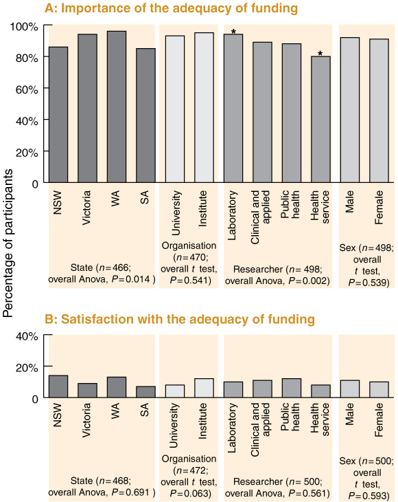 Adequacy of funding was rated either “very” or “extremely” important by 91% of all respondents (455/498), and tended to be more important to laboratory-based researchers. Across states, the adequacy of funding tended to be more important for researchers based in Western Australia and Victoria (Box 1A). Satisfaction with the adequacy of funding for health and medical research was very low, with only 10% of all researchers surveyed (51/500) being “very” or “extremely” satisfied (Box 1B).