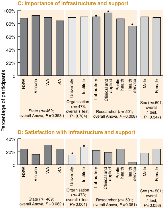 Infrastructure and support was rated by 90% of respondents (449/501) as “very” or “extremely” important to their role as health and medical researchers (Box 1C). There were significant differences in opinion among types of researchers, with infrastructure and support rated as more important to laboratory and clinical and applied researchers than to health service researchers. While 56% of all researchers surveyed (279/501) were satisfied with the level of infrastructure and support, only 21% (104/501) were “very” or “extremely” satisfied. Researchers within independent medical research institutes were significantly more satisfied with current levels of infrastructure and support than university-based researchers (Box 1D).
