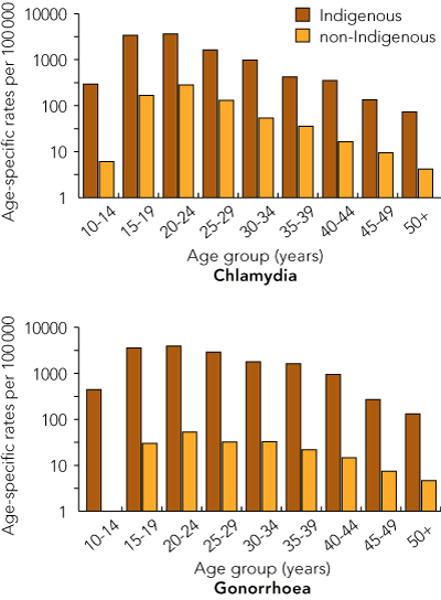 Notification rates, by age group, for both chlamydia and gonorrhoea were much higher in Indigenous people than in non-Indigenous people (Box 2). For both Indigenous and non-Indigenous people, those aged 15–24 years had the highest notification rates. The Indigenous : non-Indigenous rate ratio was particularly high in the 10–14 years age group.