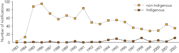Notifications of HIV in non-Indigenous people in WA peaked in the mid-1980s and have since been declining (Box 4). The same cannot be said for Indigenous people. Initially, there were few and sporadic notifications of HIV in Indigenous people, with only eight occurring before 1994. Since 1994, notifications in Indigenous people in WA have occurred in higher numbers; the Indigenous HIV crude notification rate has fluctuated considerably, with peaks in 1998 and 2002. Contact tracing did not identify a source of infection for all the 11 HIV infections diagnosed in 2002, suggesting that further unidentified infections may exist.