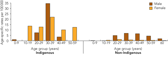 From 1994 to 2002, there were 421 HIV notifications in WA residents: 52 (12.4%) in Indigenous people and 369 (87.6%) in non-Indigenous people (Box 3). Average annualised age-standardised rates in Indigenous women were much higher than in non-Indigenous women, with a rate ratio of 18.