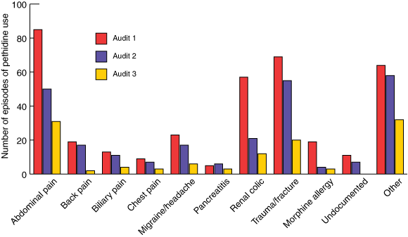 3 Indications for pethidine use documented by emergency department staff during the three audit periods (participating hospitals only)