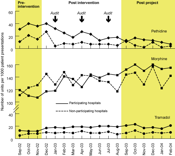 Results: In the 12 months between the preintervention period and the equivalent post-intervention period, pethidine use decreased by 62% in project hospitals (4669 to 1793 units) and 56% in control hospitals (1476 to 648 units). Six months after project completion there was a significantly greater reduction from baseline in participating hospitals (71%; 4669 to 1348 units) compared with non-participating hospitals (64%; 1476 to 532 units; P < 0.001). There was a concurrent increase in use of both morphine and tramadol.
