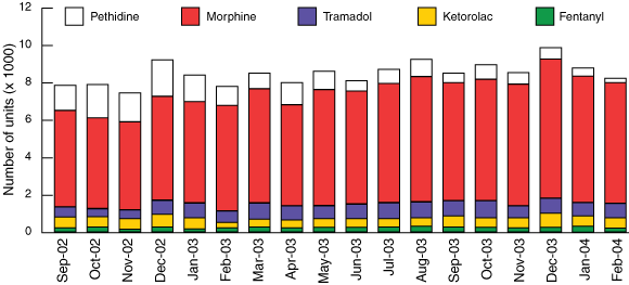 Distribution of parenteral analgesics (pethidine, morphine, tramadol, fentanyl and ketorolac) from pharmacy to the ED and other wards was used to monitor analgesic use. As pethidine, morphine and fentanyl are accountable drugs, distribution figures were considered to correlate closely with prescribing.