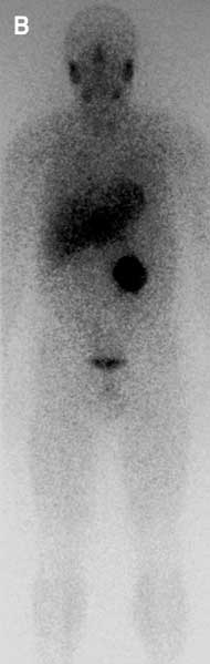 The most commonly used functional study for detecting phaeochromocytoma is scintigraphy with 131I-labelled metaiodobenzylguanidine (131I-MIBG), which has specificity of over 95% but sensitivity of only 77%–90%.21 Scintigraphy using MIBG labelled with 123I instead of 131I is reported to yield superior images, but the short half-life of this isotope (13.2 hours) limits its use to metropolitan centres with a nearby cyclotron (Box 2B).