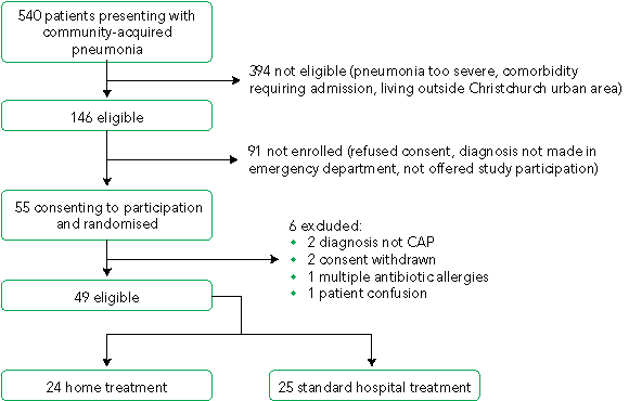 The following additional exclusion criteria were applied: living outside the Christchurch metropolitan area; in hospital-level accommodation or of no fixed abode; living alone with no alternative accommodation; serious comorbidity requiring hospital treatment;7 pneumonia which was not the primary cause for hospital admission, was distal to bronchial obstruction or was associated with pleural effusion; and expected death. Patients who had tuberculosis, bronchiectasis or HIV infection or were immunocompromised were also excluded, along with patients who had been in hospital within the previous 14 days, had pulse oximetry oxygen saturation < 92% on air, or had previously been entered in the study.