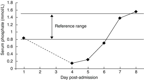 Although non-specific, we believe the constellation of symptoms and signs observed in our patient is typical of refeeding syndrome. Most importantly, acute, severe hypophosphataemia not present on admission was noted 4 days after oral refeeding with a ward diet. The presence of a serum phosphate level of 0.15 mmol/L in our patient represents extreme hypophosphataemia. (The lowest published level we are aware of in a patient who survived is 0.07 mmol/L.11) Given the “low normal” value on admission and the patient’s risk factors for refeeding syndrome, the serum phosphate level should have been monitored more closely during the first few days of admission.