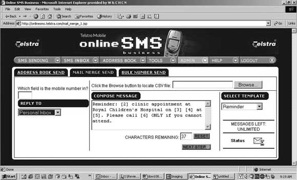 These data were uploaded into the Telstra mobile online SMS business system (Box 1), which inserted them into a standard message template of up to 160 characters. The message was designed to maintain patient confidentiality and did not include information that could link the clinic appointment to the patient.