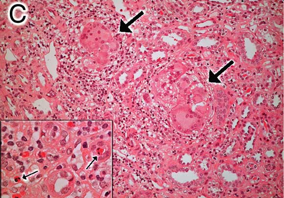 ![]() C: Renal biopsy specimen (Patient 2) showing tubulointerstitial mononuclear infiltrate with non-caseating granulomas and multinucleated giant cells (large arrows) (haematoxylin–eosin stain, original magnification x 200). Inset: Small arrows highlight eosinophils with typical bilobed nuclei (x 400). |