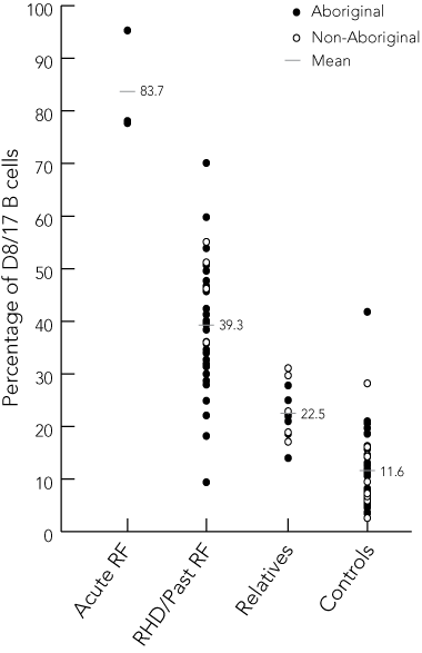 A hypothesis is that D8/17, already expressed in excess in susceptible patients, is further augmented by the process that leads to RF. This suggests that D8/17 might be incorporated into the Jones criteria for the diagnosis of acute RF,17 either as an additional major manifestation, or as an obligatory feature in all diagnoses of acute RF. We are presently evaluating this in a larger, prospective study.