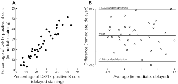Box 4A shows a good correlation between the results for the D8/17 analysis of blood stained immediately and that stained with a delay of about half a day (mean, 0.55 days; SD, 0.2) for 38 sample pairs (correlation coefficient [r] = 0.94). A Bland–Altman plot (Box 4B) confirmed that differences between the two methods were not related to the level of D8/17 positivity. There was poor correlation between the results of the D8/17 assay obtained from analysis of fresh whole blood compared with frozen PBMC, in 19 sample pairs (r = 0.32).