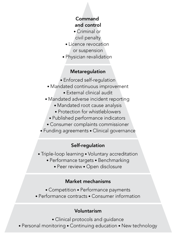 The health sector is characterised by complexity, a plurality of players (national and state governments, public and private providers, professions, and consumer groups), rapid change in its environment (eg, new technology and new global diseases), and a recent proliferation of regulatory agencies and regulatory strategies. We argue that “responsive” regulation — the use by regulators of mechanisms that are responsive to the context, conduct and culture of those being regulated — is a promising strategy for improving the quality and safety of patient care. These ideas were elaborated in our discussion paper The governance of health safety and quality, which presents contemporary research on regulatory thinking, including examples from other high-risk industries.1 While definitions of regulation abound, we use the term to mean governance in the broad sense of steering the flow of events, rather than the narrow sense of enforced compliance with rules.2