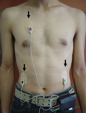 A palm-sized electrocardiograph (ECG) unit (Active Tracer, GMS, Tokyo, Japan) was used for continuous monitoring of variation in participants’ autonomic nervous activity, as computed from changes in the RR interval. The ECG unit (7 cm high × 7.7 cm wide × 1.5 cm deep, weighing 87 g) was worn in a pouch at the waist with three electrodes taped to the chest (Box 1). When variability of the RR interval was obtained, the maximum entropy method was automatically applied to analyse the power spectrum. HF power was calculated from the RR values in designated 60-second intervals, and used as the index for parasympathetic neural activity. The validity of analysing HRV to assess autonomic nervous function has been verified in studies using autonomic nerve blocking agents;10,18,19 spectral analysis of the RR interval cannot be used in patients with atrial fibrillation, atrial flutter, or ventricular fibrillation.