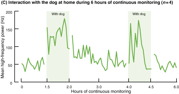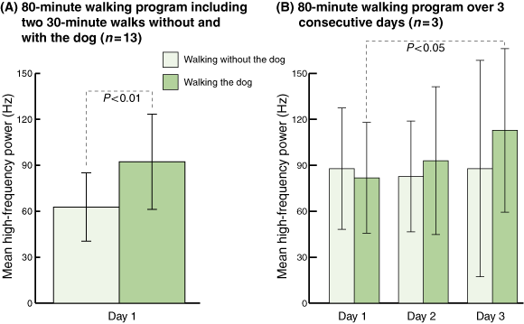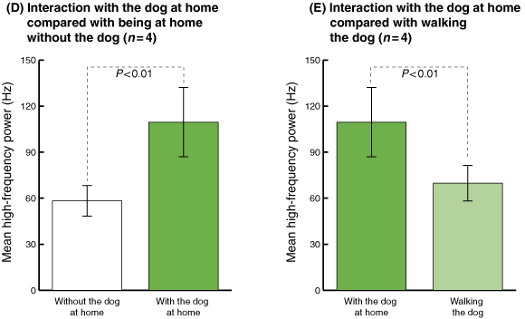 Results: During dog-walking, HF power increased significantly (P < 0.01); this increase was sustained throughout each dog walk, and was more pronounced during succeeding dog walks. At home, HF power was 1.87 times greater when the dog was present, and 1.57 times greater (P < 0.01) than in the walking experiment.