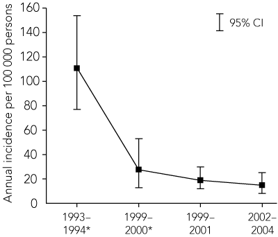 We also observed a 58% decline (95% CI, 47%–75%) in the incidence of IPD in Indigenous children aged 5–14 years from 1999–2001 to 2002–2004. Although the small number of cases precludes any certainty, it is quite possible that a herd immunity effect, with vaccinated young Indigenous children indirectly protecting their older siblings,7 is involved. A recent decline in IPD in people aged 5–17 years, presumably a similar older sibling herd immunity effect, has recently been reported from the United States.14