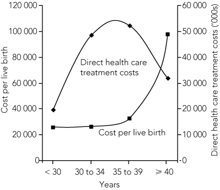 The most health care resources were consumed by the 35–39 years age group (34%) and the 30–34 years age group (32%). The ≥ 40 years age group consumed 21% of resources, despite having the highest cost per live birth (Box 4).