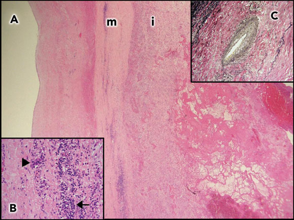 1 Aortic wall of Patient 1 ![]() A: Aortic wall (2 x objective) with thickened media (m) and intima (i). |