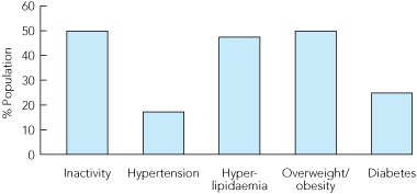 Primary prevention of cardiovascular disease: In 2001, physical inactivity was second only to tobacco smoking as a cause of total disability and death in Australia.20 Sedentary patients have a 1.5–2.0 times greater risk of cardiovascular events. Recent activity rather than being active earlier in life confers greater benefit.21 Box 1 illustrates the high prevalence of physical inactivity as a cardiovascular risk factor when compared with other well accepted risk factors.
