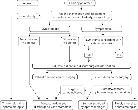 In an attempt to improve access to care, a specialist nurse-led cataract clinic was introduced in the Department of Ophthalmology at Flinders Medical Centre in 2003. It was proposed that an ophthalmic nurse practitioner could assess patients for visually disabling cataract and provide specialist postoperative care for cataract surgery patients, as has occurred elsewhere.3,4 The intention of the clinic was twofold. Firstly, it would expedite direct transfer to the surgeon of patients who would benefit from cataract surgery, thus reducing waiting times and freeing up ophthalmology clinic appointments for other patients. Secondly, it would provide continuity of care for public cataract patients.
