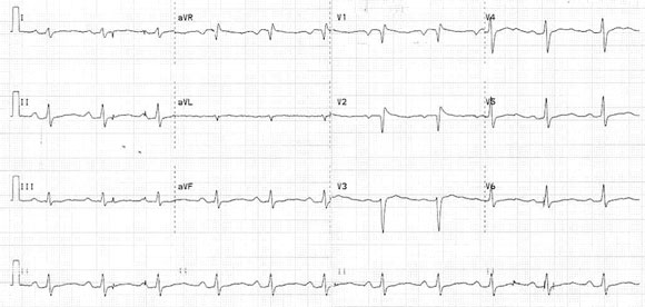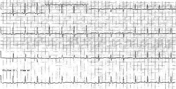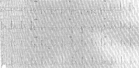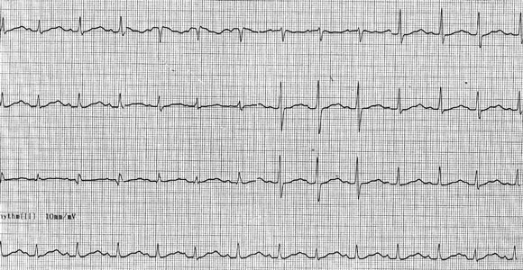 A 40-year-old man presented to a hospital emergency department after ingesting amisulpride (32 g), mirtazapine (300mg), valproate (7 g), amitriptyline (1.25 g) and omeprazole (unknown quantity). On arrival, he had a GCS of 14, heart rate of 90 bpm, and blood pressure of 120/70mmHg. An ECG at presentation showed sinus rhythm with a heart rate of 90 bpm, QT interval of 460ms and bifid T waves. He was admitted to the intensive care unit. About 12.5 h after ingestion, he developed a broad complex tachycardia with rate 120 bpm (left bundle branch pattern), but remained haemodynamically stable. The QRS complex did not significantly narrow when the patient was treated with a bolus of NaHCO3. An NaHCO3 infusion was started, and he was intubated and ventilated. Eighteen hours after ingestion, the QT interval was 560ms, with heart rate of 79 bpm and a normal QRS interval (Box 2A).