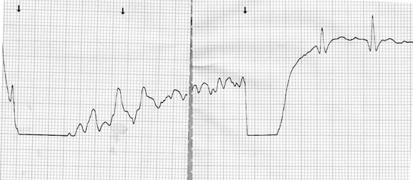 Seven hours after ingestion, he had an episode of pulseless torsades de pointes (Box 3B). Cardioversion was achieved with a 200 J direct current shock. As the QT interval remained prolonged (600 ms), therapy with isoprenaline (60 μg/h) was begun. After an hour, the dose was decreased to 30 μg/h and continued for 20 h.