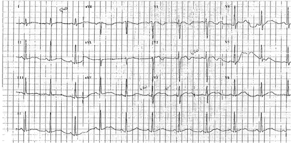 On arrival, 7 h after the overdose, her condition remained unchanged. An electrocardiogram (ECG) showed sinus rhythm, heart rate of 67 bpm, QRS interval of 128 ms, prolonged QT interval of 560 ms and bifid T waves (Box 1). Twelve hours after ingestion, her level of consciousness decreased (GCS, 4), and broad complex tachycardia was observed on the electrocardiography monitor and subsequent ECG. No hypotension was recorded. She was intubated, hyperventilated, given NaHCO3, magnesium and calcium gluconate, and transferred to the intensive care unit. The QRS interval narrowed to 112 ms within 4 h, but the QT interval remained prolonged for another 12 h.
