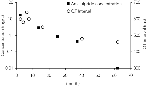 The patient had a second episode of torsades de pointes almost 24 h after ingestion. This was asymptomatic and resolved spontaneously within 30 seconds. He had bradycardia (heart rate, 40 bpm) for 24 h after isoprenaline was ceased. The QT interval gradually decreased to 460 ms at 62 hours after ingestion and was 360 ms 3 weeks later (Box 3C). Box 3D illustrates the time course of serum amisulpride concentration and absolute QT interval over the first 60 h after ingestion.