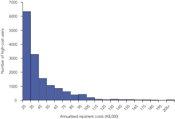 In the 2003–04 financial year, it was estimated that Australia spent 9.7% of its gross domestic product (GDP) on health, a total of $78.4 billion or about $3919 per person.1 Although there has been a shift towards deinstitutionalisation, hospitals remain the largest providers of health services in Australia, having received 34.9% of total recurrent health expenditure in 2002–03.1 Despite this, little is known about the characteristics of hospital users, particularly those who use a disproportionate share of resources (“high-cost users”).