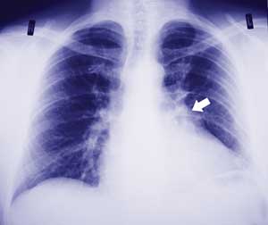 A: Chest x-ray showing the incidental finding of a left hilar mass (arrow).