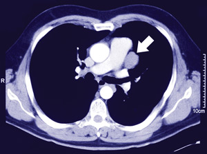 Nuclear medicine studies with either 99mTc sulphur colloid, 111I-labelled platelets or 99mTc heat-damaged erythrocytes demonstrate an increased uptake of the radioactive isotope in ectopic splenic tissue. The 99mTc heat-damaged erythrocyte study is more specific because of reduced uptake of 99mTc in otherwise normal liver tissue.3 When a localised area of uptake corresponding to the mass is detected — supporting the diagnosis of thoracic splenosis — no further treatment is required.1-3