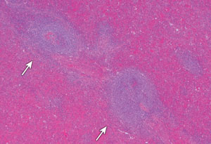 C: Histological section of the left hilar mass demonstrating lymphoid foci (arrows) surrounded by splenic red pulp.