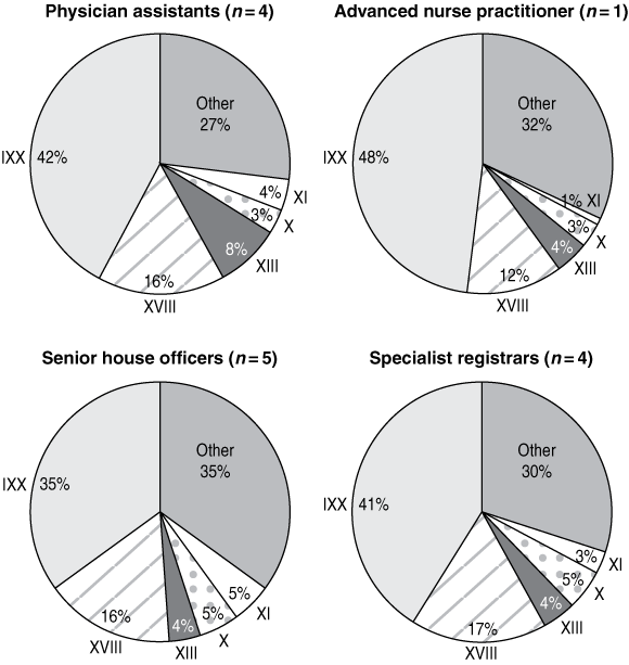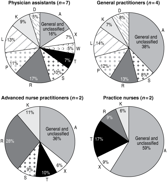 PAs and their supervising GPs had a similar spread of activity across the 17 chapters of the International classification for primary care (ICPC),11 but there were considerable differences between the activity patterns of GPs and PAs and those of practice nurses and ANPs (Box 1), although the number of nurses sampled is small. Ten per cent or more of GPs’ and PAs’ activity was coded in each of three ICPC chapters — psychological, respiratory and musculoskeletal — although the differences in the activity of each of the professional groups are indicative of differences in their professional roles. The variations in activity pattern between individual practitioners are also indicative of prior experience, subspecialisation and practice organisation.