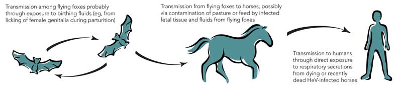 After these two outbreaks, extensive investigations identified fruit bats (Pteropus spp.), commonly known as flying foxes, as the likely natural reservoir of HeV; the infection is probably subclinical in most infected flying foxes.6,7 Although it is not certain how HeV could be transmitted from flying foxes to horses, the isolation of the virus from uterine fluid and aborted fetal tissue of flying foxes suggests that horses could ingest the virus on feed or pasture recently contaminated by birth products (Box 2).6,7 The available evidence indicates that transmission of the virus from horses to people, albeit rare, occurs through physical contact with nasal and oral secretions emanating from very ill, dying or dead horses.8