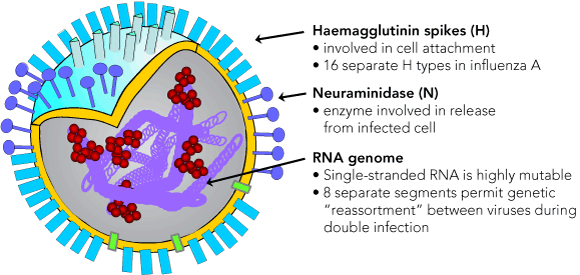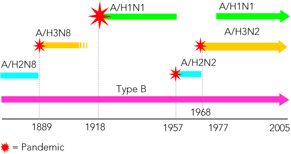 These two surface antigens of both influenza A and B undergo gradual, progressive antigenic variation, referred to as “antigenic drift”, which allows the viruses to escape immunity acquired through infection or vaccination and to cause further outbreaks and epidemics. These changes can also be seen by phylogenetic analysis of the HA and NA gene sequences.1 In addition, influenza A viruses with three antigenically distinct HAs and two distinct NAs have circulated in the human population since laboratory studies commenced, and the influenza A viruses are now divided into subtypes based on their HA proteins.12 The Asian and Hong Kong pandemics were found to involve the emergence of new influenza A subtypes in the human population, so few or no people had any immunity to the HA antigens; this is referred to as “antigenic shift”.13 Separate subtypes of influenza B have not been observed, and it does not appear that influenza B is involved in pandemics (Box 3).