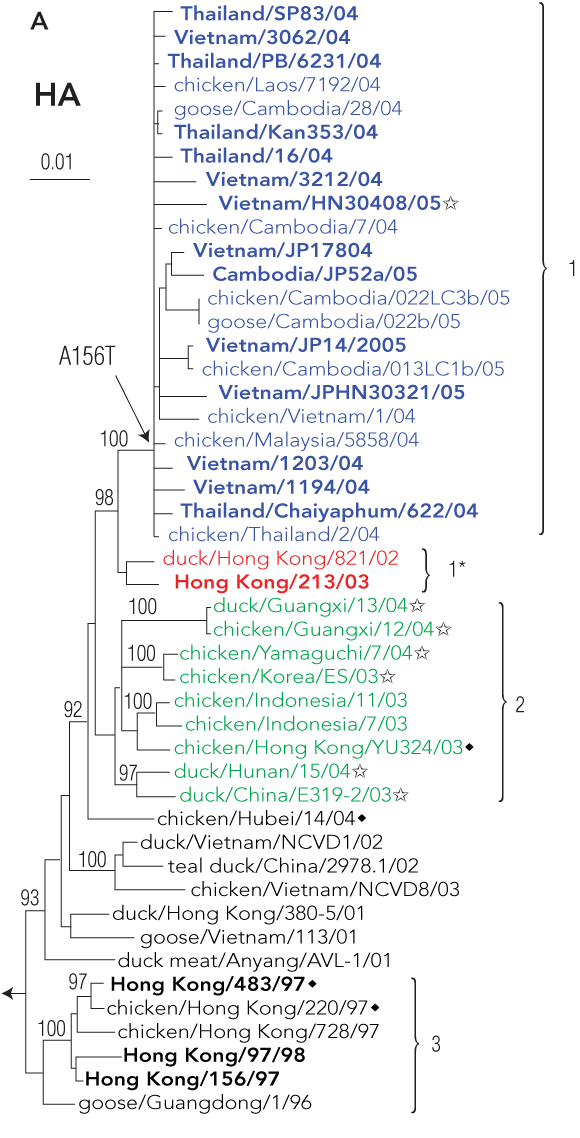- 31. Smith GJ, Naipospos TS, Nguyen TD, et al. Evolution and adaptation of H5N1 influenza virus in avian and human hosts in Indonesia and Vietnam. Virology 2006; 350: 258-268.