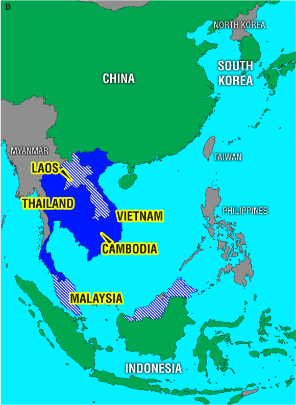 Phylogenetic relationships among H5 haemagglutinin genes from avian influenza A/H5N1 viruses, and their geographic distribution. Viral isolates collected before and during the 2004–2005 outbreak in Asia and selected ancestors are included in the analysis. A: The differing groups or “clades” of haemagglutinin are coloured blue, red, and green. Names in bold denote isolates from human infections. B: Geographic distribution of H5N1 in East Asia: solid blue denotes countries reporting infections with clade 1 H5N1 in humans and birds, cross-hatched blue denotes countries reporting clade 1 H5N1 infections in birds only, and green denotes countries reporting bird infections with clade 2 H5N1. Reproduced from reference 30 with permission from the Centers for Disease Control and Prevention, USA.