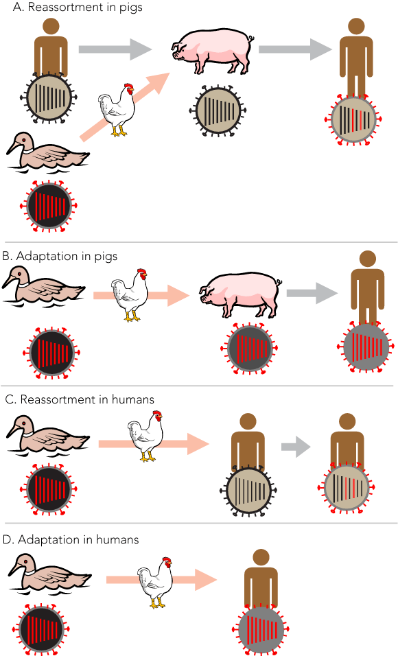 The genomes of influenza A and B viruses consist of eight separate segments of single-stranded, negative-sense RNA. Mutations resulting from the error-prone replication of the single-stranded RNA, and an ability to produce genetic hybrid or reassortant viruses by the mixing of gene segments from two viruses when dual infection occurs both contribute to the evolutionary success of these viruses.11 Although an influenza A virus from swine had been identified in the 1930s, it was not until the 1950s and 1960s that influenza A viruses were found in a number of animal and bird species.14 It was suspected that non-human hosts may play a role in the evolution of pandemic influenza, particularly when it was discovered that viruses with an HA antigenically related to that of the 1968–1969 pandemic virus had been isolated from birds and horses some years earlier. It also appeared that the 1968–1969 pandemic virus may have been derived by genetic reassortment, as the NA antigen was antigenically equivalent to that of the human viruses of the preceding subtype.15 Subsequently, with the benefit of molecular techniques, it was confirmed that the viruses of both the Asian (H2N2) and Hong Kong (H3N2) pandemics were reassortants containing genes derived from the previously circulating human influenza subtype and genes that appeared to have been derived from avian influenza viruses.16
