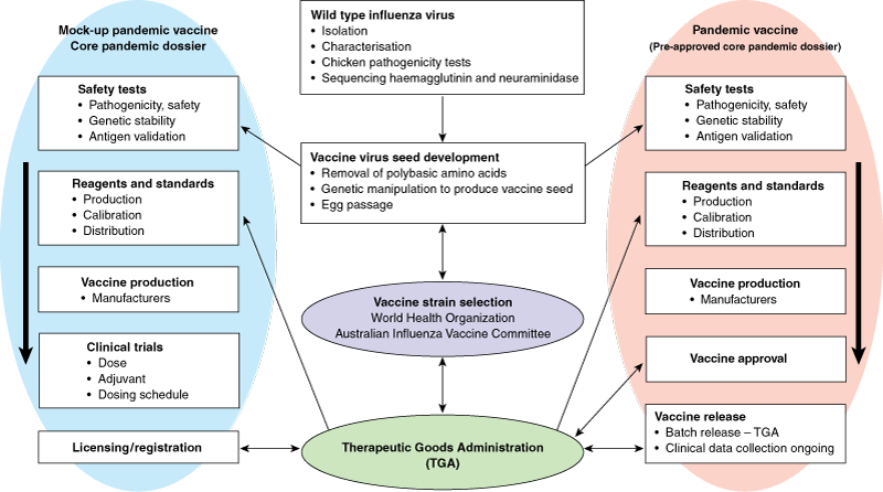 Ideally, the mock-up vaccine would be produced in the same way as intended for the pandemic vaccine, whether from cell culture or egg; comparisons would be made between whole virion and split or subunit vaccines; it would have similar antigen content as any future pandemic vaccine; and it would have the same adjuvant system (if used) as the future pandemic vaccine. The dossier containing pre-clinical (quality, safety and immunogenicity) and clinical data would be submitted to the TGA for evaluation. In the event of a pandemic, an application for a product variation would be submitted, containing the manufacturing and quality control data relating to the pandemic influenza strain and a commitment from the sponsor to gather clinical information during the pandemic (Box). This would permit a faster approval process.